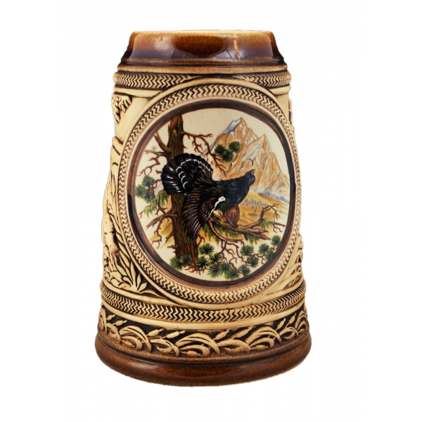 Оригинальная пивная кружка выполненная вручную. На кружке изображены собаки, охотившиеся на уток и на Глухаря. Очень гармонично сочетается натуральная прорисовка с деколем по центру, которая зафиксирована художником в круглую узорчатою рамку.