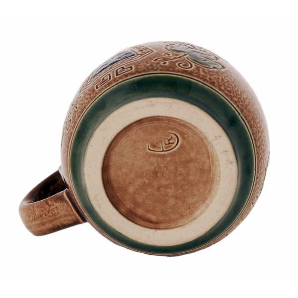 Пивная кружка с крышкой производства Германии, конец ХХ века. Кружка рельефная, в зелено - синих тонах. На рисунке изображена женщина, собирающая шишки хмеля. Материал - керамика. Высота кружки - 14 см, объем - 400 мл.