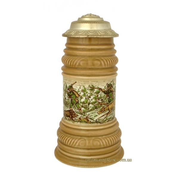 Кружка для пива изготовлена из высококачественной керамики, а крышка на ней - из пищевого олова и украшена цветком и узорами. Сама кружка создана в нежных природных тонах. На пивной кружке - сюжет охоты. Объем пивной кружки - 900 мл. Изготовлена во второй половине 20 века и имеет отличное коллекционное состояние.