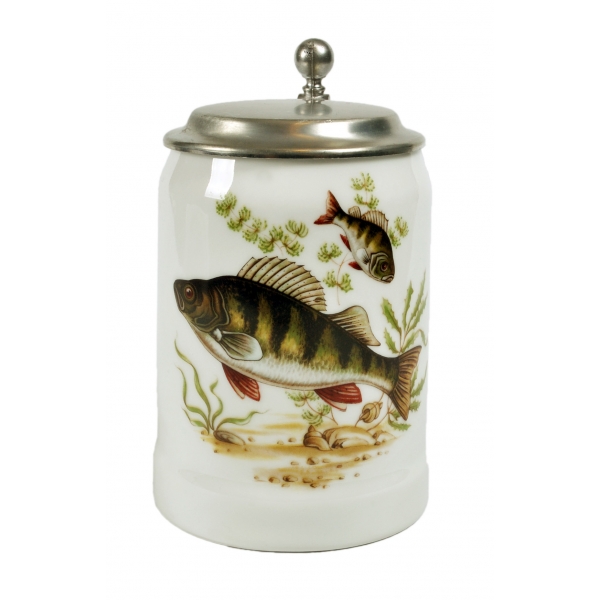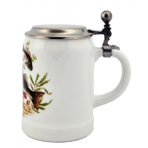 Красивая, прочная кружка для пива с крышкой из олова с изображением плавающих рыб. Оригинальный презент любителям ловли рыбы и коллекционерам пивных кружек.