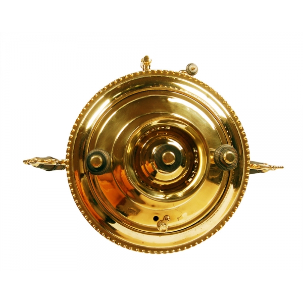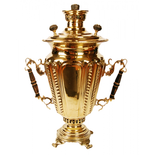 Подойдёт для чаепития в большой компании, объем самовара достаточно большой – 9 л. Угольный самовар обладает приятным золотистым оттенком, ведь он изготовлен из латуни. Различные витки, узоры, природные мотивы и затейливые детали не утяжеляют композицию. Наоборот, можно долго наслаждаться изысканным и одновременно лёгким дизайном самовара.