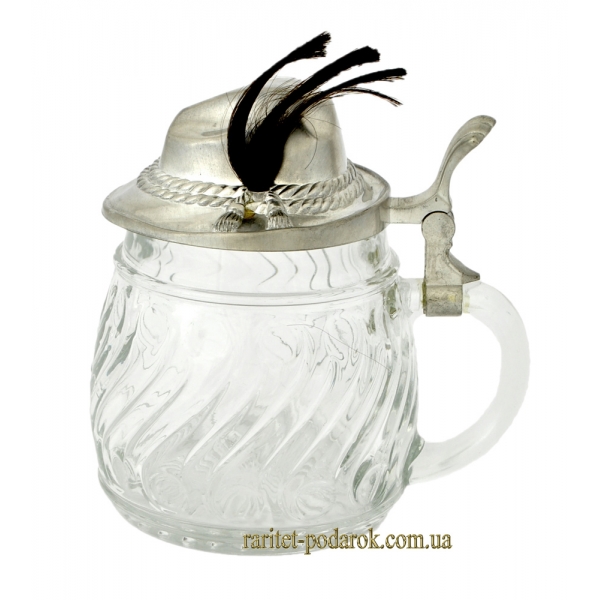 Стеклянная пивная кружка "Тирольская шляпа" (баварская) производства Германии, вторая половина 20 века. Производитель - компания "BMF". Крышка на стеклянной пивной кружке изготовлена из пищевого олова в форме тирольской (баварской) шляпы с украшением. Высота - 15 см.