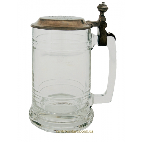 Изготовлена стеклянная пивная кружка из пищевого стекла. Материал крышки – олово. Высота: 15 см, объём - 500 мл. Производство: Германия, 20 век. Сохранность хорошая, в использовании не была.