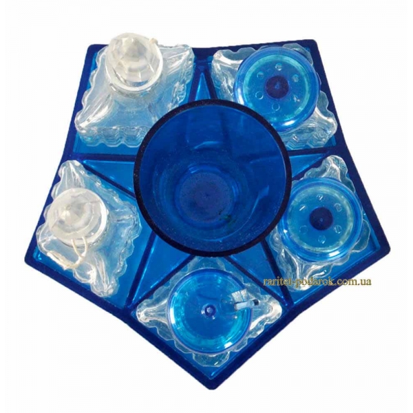 Материал: стекло, пластик. Общая высота набора - 13,5 см. Размеры подставки в виде звездочки - 13,5 *13,5 см.